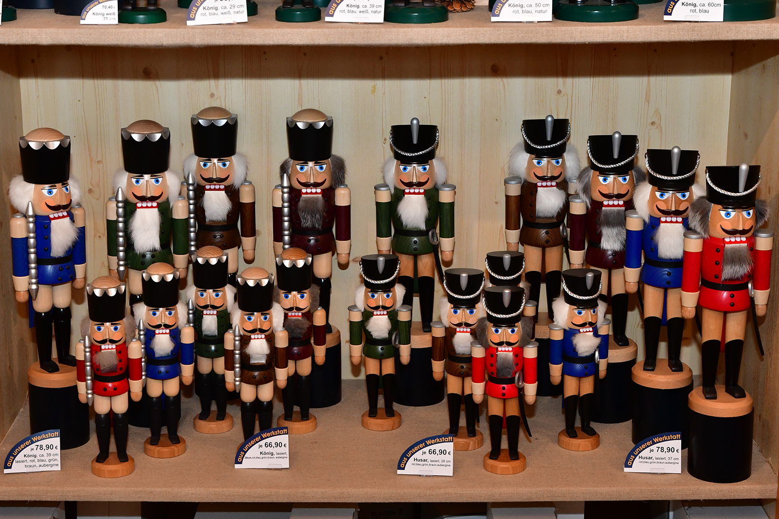 Die Nussknacker werden in etwa 150 Arbeitsschritten aus ca. 35 Einzelteilen, in einem ganz speziellen Design und mit geheimnisvollen Details in der Manufaktur hergestellt. Ein Nussknacker der Größe 40 Zentimeter besteht aus etwa 35 Einzelteilen und es werden ungefähr 150 Arbeitsschritte überwiegend in Handarbeit ausgeführt, bis diese Traditionsfigur fertiggestellt ist. Im Anschluss wird die Qualität jedes einzelnen Nussknackers geprüft, bevor die majestätischen Figuren sorgfältig verpackt werden und zum Verkauf sowie zum weltweiten Versand an unsere Kunden und Händler bereitstehen.